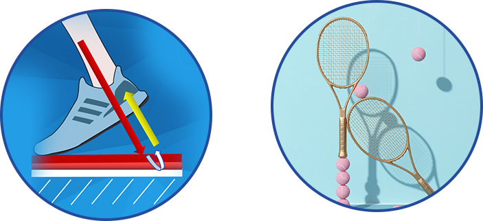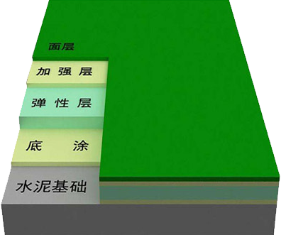 針對PU材料的軟質表面陷球、粘球、反彈不均等缺陷,硅PU面層創(chuàng)新性的上硬下彈結構能提供足夠的反彈承托,結合加強層、彈性層、防水層提供回彈特性,四層人體工學結構可以高度護航均勻反彈和保障運動球感。