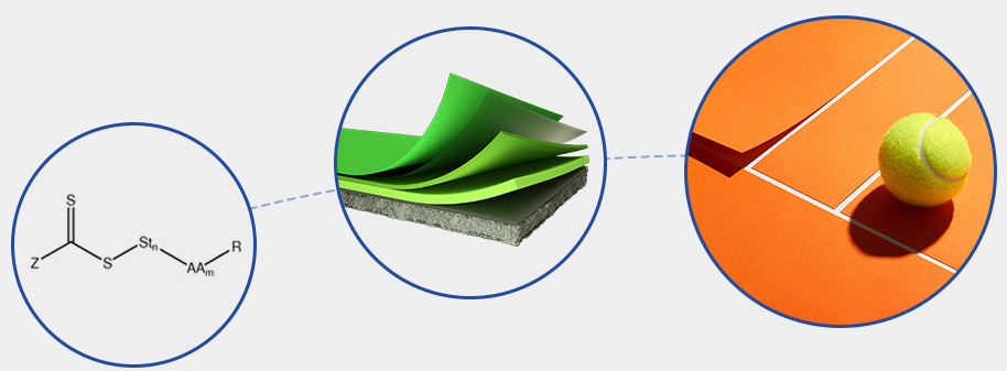 Dynice研發(fā)部經(jīng)過三年的探索,以可逆加成-斷裂鏈轉移聚合(RAFT)的方式制備出具有超強耐磨性、防滑性、抗污性、耐候性的水性面漆,亦即是Four in one(FIO)綜合面層,有效解決了運動面層在使用中易損易臟易滑等現(xiàn)象。